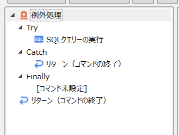 この例は、パラメーターで指定された条件より、SQLクエリ実行コマンドで条件に一致するレコードを取得し、取得した結果を戻り値として返すという処理になります。例外発生時にはリターン(コマンドの終了)コマンドで強制的にFinallyに行かずに処理を終わらせることで、例外時の戻り値と正常時の戻り値をコントロールします。