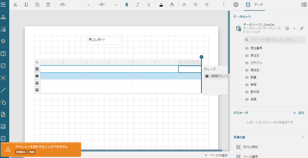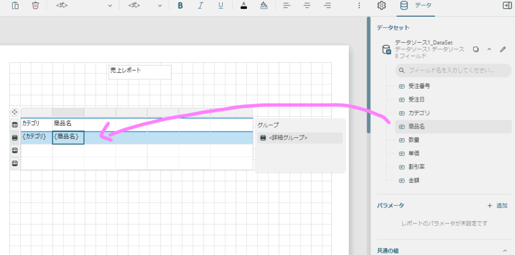 どうしたらいいかわからないから、引き続きオンラインヘルプ(シンプルなレポートの作成)をしっかり真似ていきます。