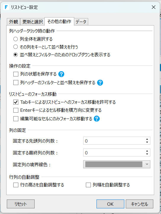 ①リストビューの設定で「その他の動作」タブを選択します。