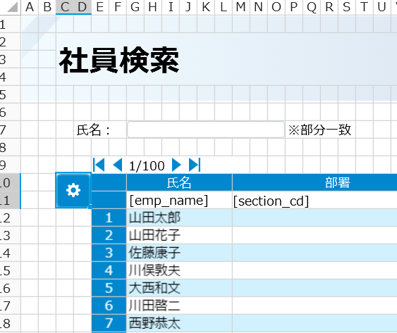 基本設定は、Excelライクなリストビューでの設定①~基本設定編~にて確認をお願いします。直接編集が必要ない場合は、[更新と選択]タブの更新処理で「編集を許可」と「新規行の追加を許可」を初期値(チェックなし)にしておいてください。