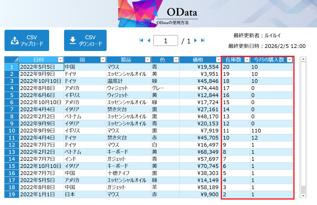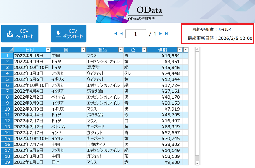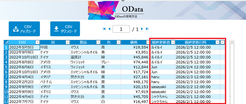 1行ごとに最終更新者/最終更新日時が表示されるため、