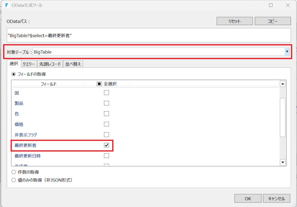 取得項目は「最終更新者」のみを選択します。