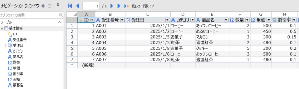 まずは表の中身である「受注情報テーブル」をチェック。