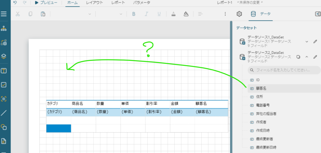 まずはレポートに設定しているデータソース、もとい顧客情報テーブルの設定を直します。
