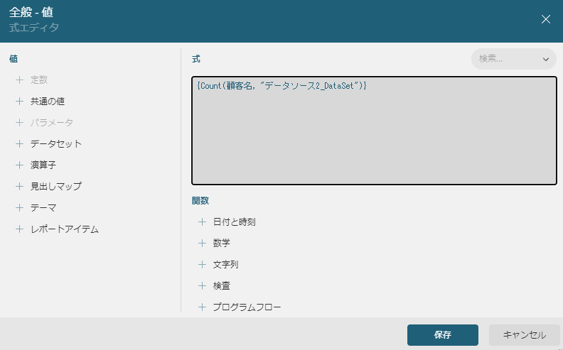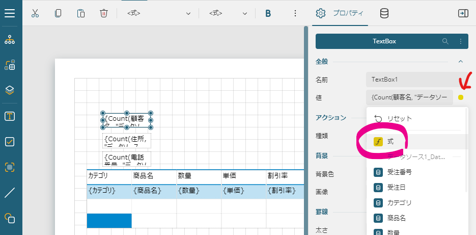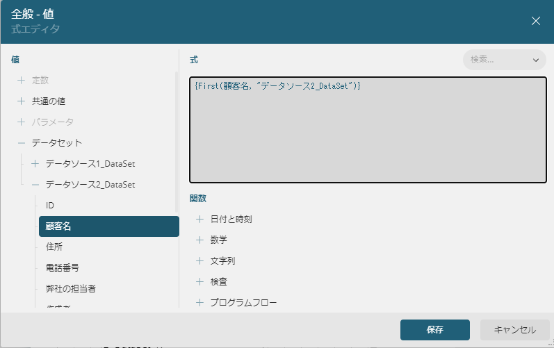 式の中身を一旦消して、左側のデータセット内にある表示したい値をクリックします。