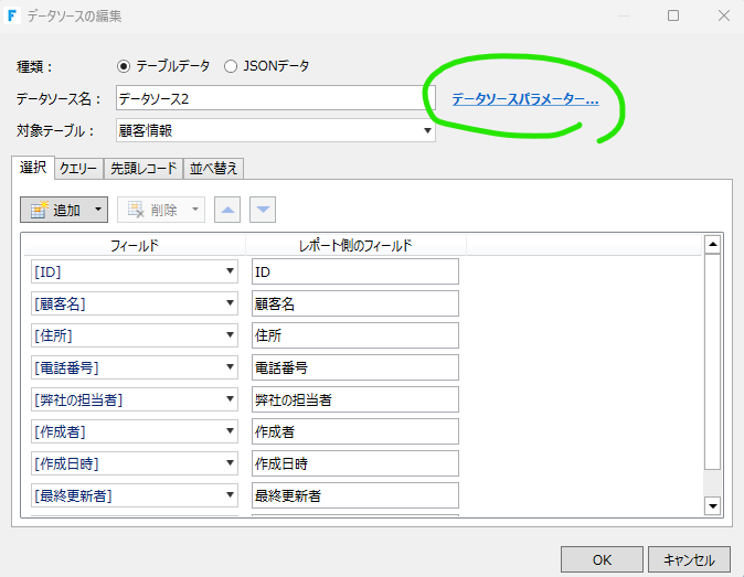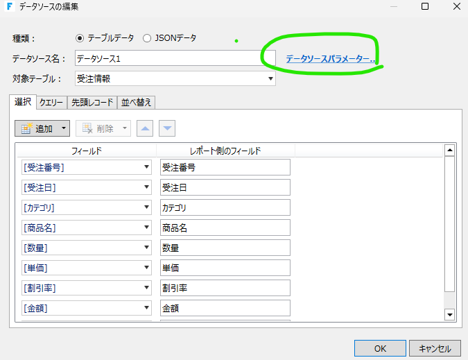 データソースのパラメーターをクリック