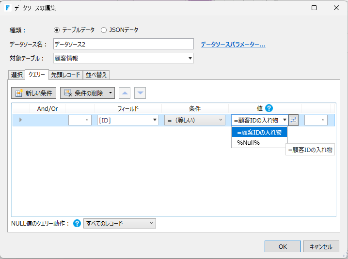 作った「顧客IDの入れ物」を使って、クエリータブで条件設定をします。