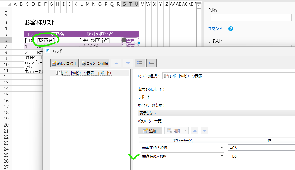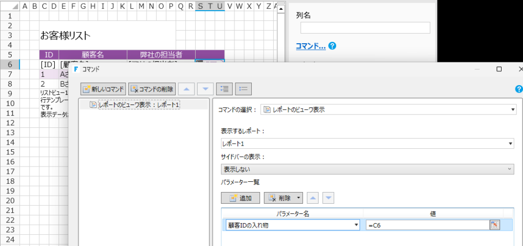 これで「リストビューのID」と「リストビューの顧客名」を「パラメーターに入れて」から「レポートを表示する」ことができるはず!いざデバァァッグ。