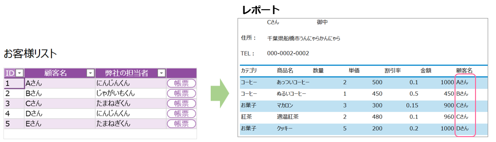 私が今回やりたい「指定した顧客情報の値をレポートに出力する」は、