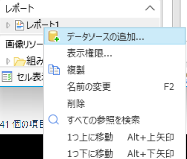 追加したテーブルをレポート画面で呼び出すには、作ったレポートで右クリックして「データソースの追加」を押下するんでした。